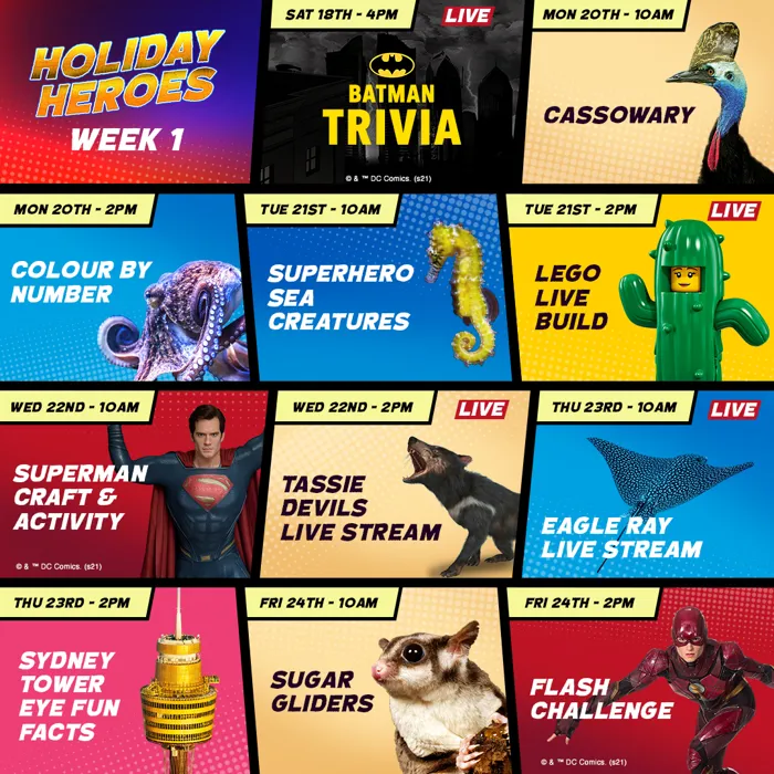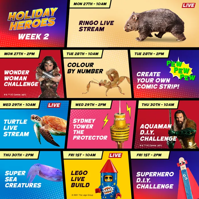 Each week of the School Holidays SEA LIFE Sydney Aquarium, WILD LIFE Sydney Zoo and guest stars, LEGO LAND Discovery Centre Melbourne will be flying into your homes with their super-themed live streams!